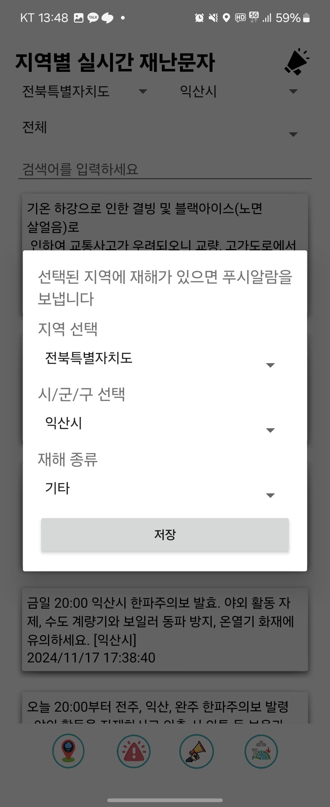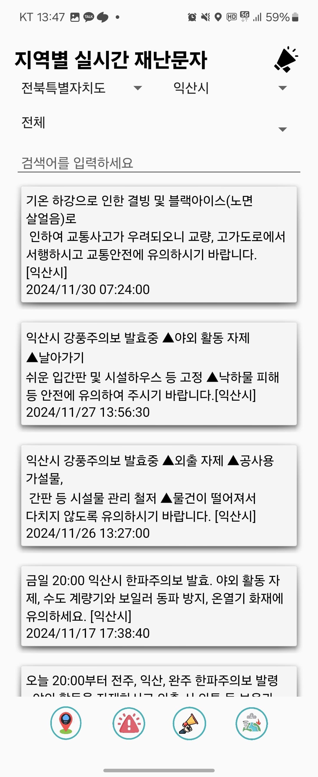 지진, 화재, 홍수 등 재난 발생 시 실시간으로 재난 문자를 제공.