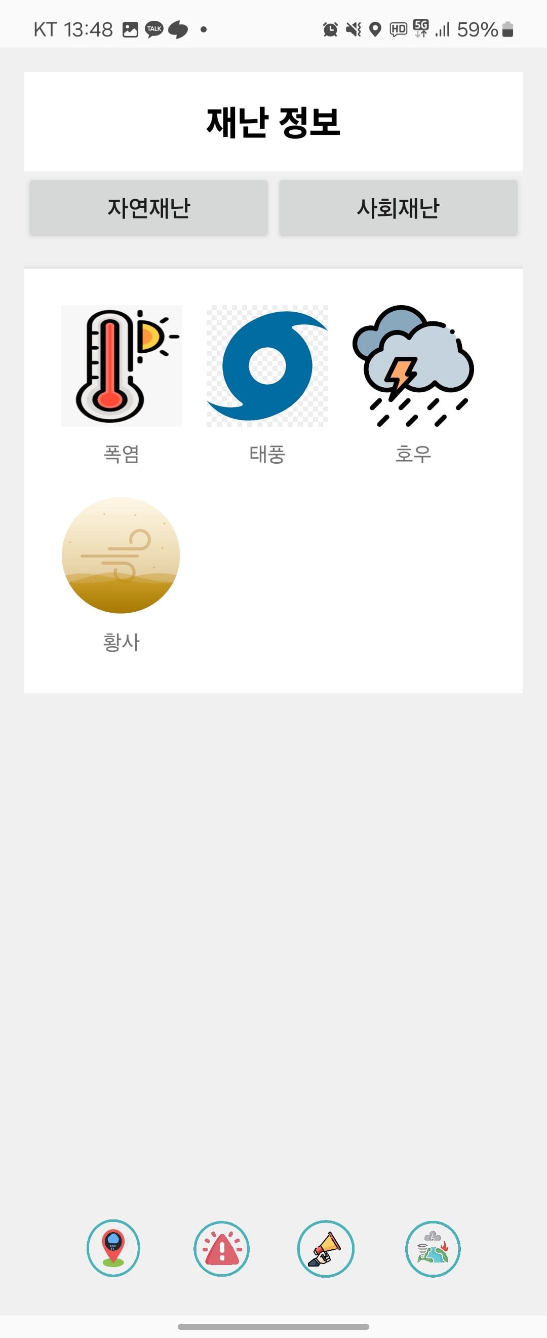 재난 및 긴급 상황은 언제든지 발생할 수 있으며, 이러한 상황에서 적절하고 신속한 대응은 피해를 최소화하는 데 필수적입니다. 하지만 많은 사람들이 재난 상황에서 올바른 대처 방법을 모르거나, 필요한 정보를 제때 받지 못하는 경우가 많습니다. 또한, 기존의 재난 관리 시스템은 디지털화가 부족하거나 접근성이 떨어지는 경우가 있습니다. 스마트폰 보급률의 증가와 더불어 다양한 센서와 GPS 기능을 활용한 정보 제공이 가능해졌고, 이를 통해 재난 정보를 빠르게 전파하고, 사용자의 위치 기반 맞춤형 안전 대책을 제공할 수 있는 어플을 개발하였습니다.